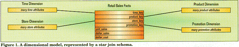 A dimensional model looks very different. Figure 1 shows a DM diagram for a typical business process: cash register sales in a large retail chain. We often call this kind of diagram a star join schema. The central table is called the fact table, and it is the largest table in the schema. It is the only one with a composite key. The rest of the fact table consists of "facts" that you can think of as numerical measurements of the business taken at the intersection of the dimensions. In an enterprise data warehouse, you can have a number of separate fact tables, each representing a different process within the organization, such as orders, inventory, shipments, and returns. These separate fact tables will be "threaded" by as many common dimension tables as possible. The surrounding tables are called dimension tables, and are much smaller than the fact table. Although the dimension tables have several descriptive text fields, they will always have far fewer rows and take up much less disk space than the fact table. Each dimension table has a single part key. The fields in dimension tables are typically textual and are used as the source of constraints and row headers in reports.