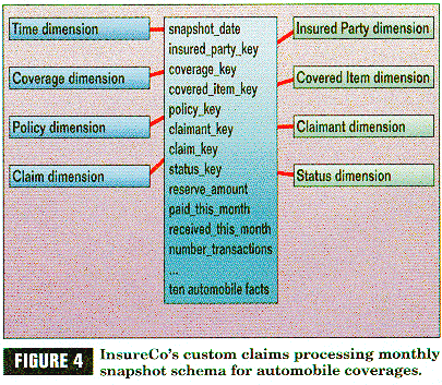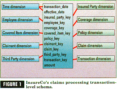 The design of a big insurance data warehouse must deal with several issues common to all insurance companies. This month, I use InsureCo as a case study to illustrate these issues and show how to resolve them in a data warehouse environment. InsureCo is the pseudonym of a major insurance company that offers automobile, homeowner's, and personal property insurance to about two million customers. InsureCo has annual revenues of more than $2 billion. My company designed InsureCo's corporate data warehouse for analyzing all claims across all its lines of business, with history in some cases stretching back more than 15 years.
