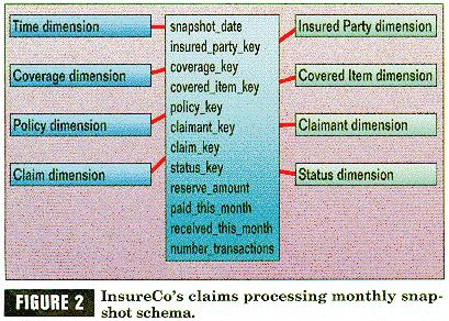This transaction-level star join schema provided an extremely powerful way for InsureCo to analyze claims. The number of claimants, the timing of claims, the timing of payments made, and the involvement of third parties, such as witnesses and lawyers, were all easily derived from this view of the data. Strangely enough, it was somewhat difficult to derive "claim-to-date" measures, such as monthly snapshots, because of the need to crawl through every detailed transaction from the beginning of history. The solution was to add to InsureCo's data warehouse a monthly snapshot version of the data. The monthly snapshot removed some of the dimensions, while adding more facts, as illustrated in Figure 2.