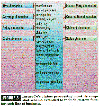 Second, the users needed to view the business in monthly intervals. Claims needed to be grouped by month, and compared at month's end to other months of the same year, or to months in previous years. This conflicted with the need to store every transaction, because it was impractical to roll-up complex sequences of transactions just to get monthly premiums and monthly claims payments. Third, we needed to deal with the heterogeneous nature of InsureCo's lines of business. The facts recorded for an automobile accident claim are different than those recorded for a homeowner's fire loss claim or for a burglary claim.
