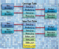 A second kind of factless fact table is called a coverage table. A typical coverage table is shown in Figure 2. Coverage tables are frequently needed when a primary fact table in a dimensional data warehouse is sparse. Figure 2 also shows a simple sales fact table that records the sales of products in stores on particular days under each promotion condition. The sales fact table does answer many interesting questions but cannot answer questions about things that didn't happen. For instance, it cannot answer the question, "Which products were on promotion that didn't sell?" because it contains only the records of products that did sell. The coverage table comes to the rescue. A record is placed in the coverage table for each product in each store that is on promotion in each time period. Notice that you need the full generality of a fact table to record which products are on promotion. In general, which products are on promotion varies by all of the dimensions of product, store, promotion, and time. This complex many-to-many relationship must be expressed as a fact table. This is one of Kimball's Laws: Every many-to-many relationship is a fact table, by definition.