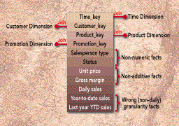 Step 4: Choosing the Facts. The grain of the fact table determines which facts you can use in the data mart. All of the facts must be expressed at the uniform level implied by the grain. In other words, if the grain of the fact table is an individual line item on a customer bill, then all of the numerical facts must refer to this particular line item. Also, as I have said many times before, the facts should be as additive as possible. Figure 1 shows a "bad" fact table with a horrible mixture of non-numeric facts, non-additive facts, and facts at the wrong grain. This design is unusable. Figure 2 shows a "good" fact table in which all of the data elements in the first design have been correctly recast so that they are as numeric and additive as possible.