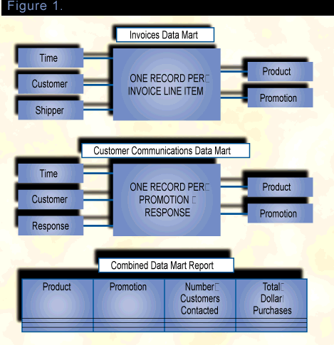 An example of two data marts with conformed dimensions (Time, Customer, Product, and Promotion). For example, these two data marts can work together to produce a combined report with Product and Promotion as row headers.
