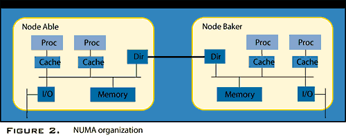 The easiest way to characterize a NUMA system is to imagine a big SMP. Now put on your safety goggles, grab a chainsaw, and cut it in half. Include memory and I/O in your bisection. Then reconnect the halves using a wire attached to the (severed) system busses. That's NUMA: a big SMP broken up into smaller SMPs that are easier to build (see Figure 2).