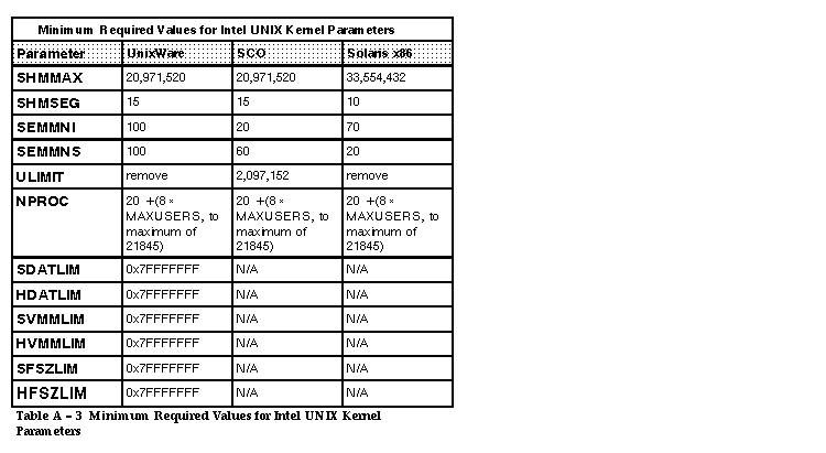 On Intel UNIX systems, the system administrator can change parameters that control the allocation of shared memory. The Workgroup Server installation process can also be used to configure this process automatically. The parameters that interact with Oracle are described as follows: