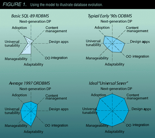 Figure 1 illustrates how this model defines the somewhat elusive universal server concept. Because a universal server may be expected to handle any type of data for any kind of application--as well as provide good manageability, tunability, and so on--an "ideal" universal server should score perfectly in each of these eight dimensions. Based on these criteria, significant progress has been made in the dimensions that are most interesting to mainstream database users. But although the object/relational releases of 1997 have moved significantly closer to the universal-server ideal, there is still considerable room for improvement.