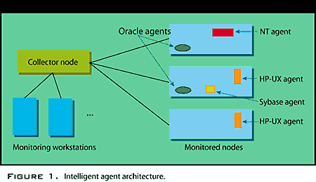 Databases no longer function in isolation: They are bound up, inseparably, with operating systems and networks, with availability and performance issues cutting across all three areas. Companies want to move systems out to their users and design their computer support according to the companies' needs (not the other way around, as was necessary when expensive computer hardware dictated the plan). For this reason, monitoring tools must be able to handle heterogeneous, highly distributed environments. The tools from Computer Associates, BMC, Platinum, and Oracle represent a new breed of monitoring/availability tools that have evolved to meet most of these requirements only in the past several years. How have they done it? One key is that all their products are based on intelligent agent architecture, a design that places independent modules, or agents, on each monitored node in a distributed system (see Figure 1). These agents are responsible for collecting performance data at the node on which they run and reporting it back to a central collector node. Workstations running GUI tools then access the data from the collector node and present it to administrators, DBAs, and other support personnel. | ||||||||||||||||||||||||||||||||||||||||||||