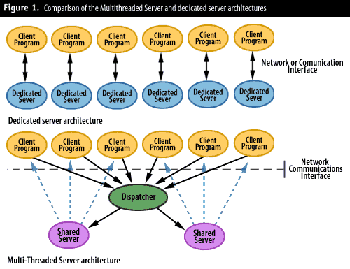 Oracle's MTS option allows multiple client programs to share a server process (see Figure 1). Without MTS, each Oracle session will usually acquire a dedicated server process. (Some operating systems, such as VMS, allow user and server processing to occur in the same process if both exist on the same host.) If MTS is enabled, processes can share servers, reducing the overall number of server processes required.